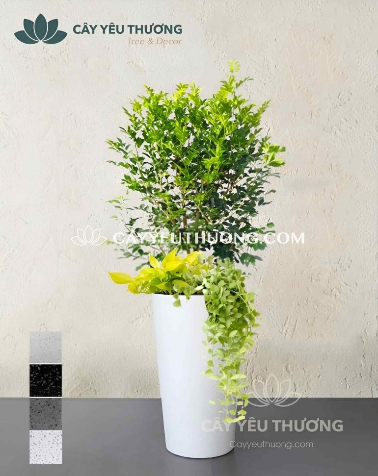 Chậu cây mix nhiều cây nhỏ ở gốc có hoa đẹp - nguyệt quế