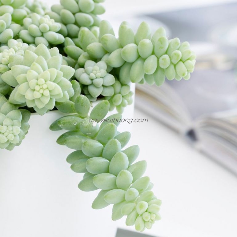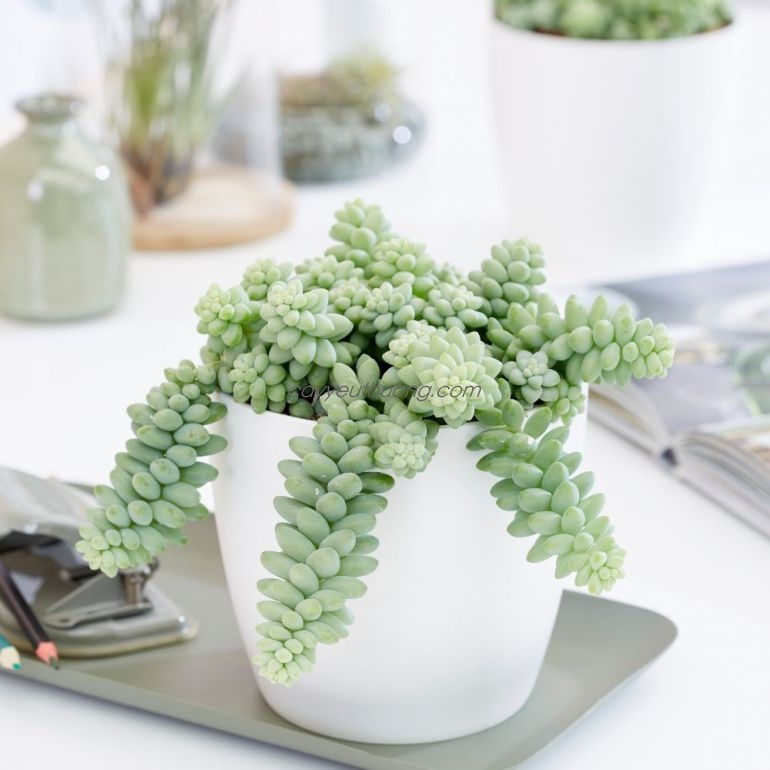 Là cây thân thảo, ít nhánh, mềm, mọc rũ. Cây sen đá chuỗi ngọc Đà Lạt có lá dày, bóng, nhiều nước, giống hình quả nho xanh, nhọn hoặc thon ở đầu, màu xanh. Lá cây chuỗi ngọc dứng xếp chồng lên nhau, tạo nên chuỗi dài. Cây có hoa màu hồng, nhỏ, mọc ở ngọn cành hoặc ở nách lá.
