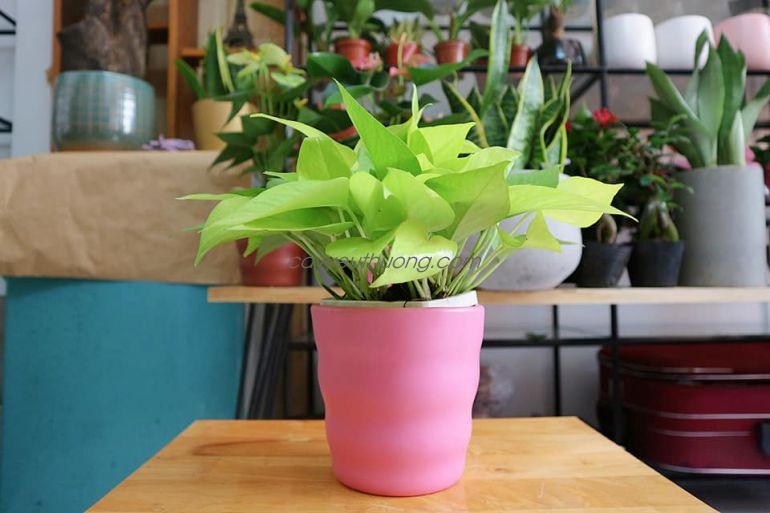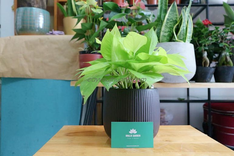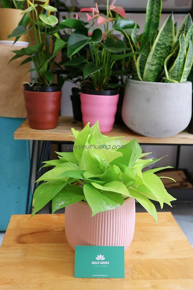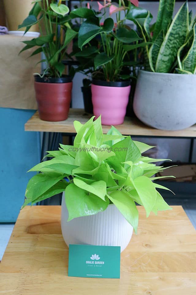 Lá Trầu Bà Thái không bầu mà thuôn dài, mặc dù thỉnh thoảng vẫn giữ được hình dáng trái tim nhưng rất ít. Màu lá cây thuộc dạng nổi bật nhất trong các loại cây Trầu Bà, đó là màu neon hay còn gọi là màu dạ quang. Lá non có xu hướng sáng màu hơn lá già. Thân cây cũng tiệp màu lá, và không bị bất kỳ sắc xanh nào xâm lấn được. Cây đặc biệt bởi quanh năm suốt tháng vẫn giữ được màu lá và sinh trưởng mạnh dù có được trồng trong bóng râm. Nếu bạn trồng Trầu Bà Neon trong nước hoặc bán thủy sinh, bạn thậm chí không cần chăm sóc, chỉ cần châm thêm nước khi cạn thôi.